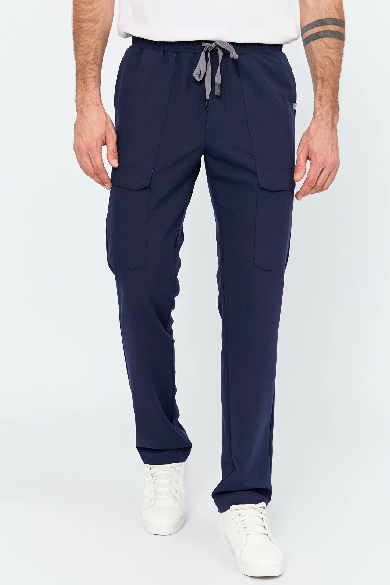 Медицинские брюки силуэта Modern fit. Заужены к низу, комфортная посадка. Притачной пояс на резинке, дополнительно есть регулировка ширины с помощью шнура. Шесть функциональных карманов — два верхних боковых и два спереди на уровне середины бедра и два задних.