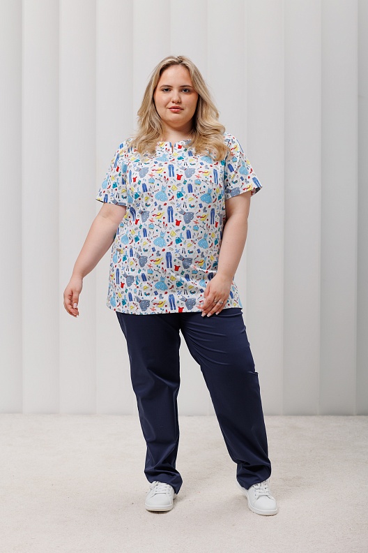Медицинская блуза полуприлегающего силуэта без застежки. Модель идеально садится по фигуре благодаря своему крою. Продуманное расположение кокеток, нагрудных, талиевых, плечевых вытачек подчеркнет достоинства вашей фигуры. Фигурная горловина позволяет легко и быстро надевать и снимать блузу. Удобные накладные карманы позволяют разместить смартфон и необходимые рабочие принадлежности. Разрезы в боковых швах добавляют свободы движения. Рукава короткие. Ткань с большим содержание хлопка и оригинальным рисунком особенно любима медицинскими работниками детских отделений.